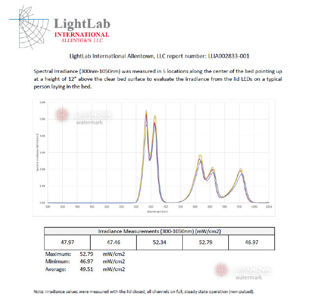 - True Irradiance: Max *52.7 mW/cm². Due to our high irradiance, shorter sessions have the same affect as other companies' lower irradiance products. (*Irradiance numbers were validated by Light Lab International Allen Town)
